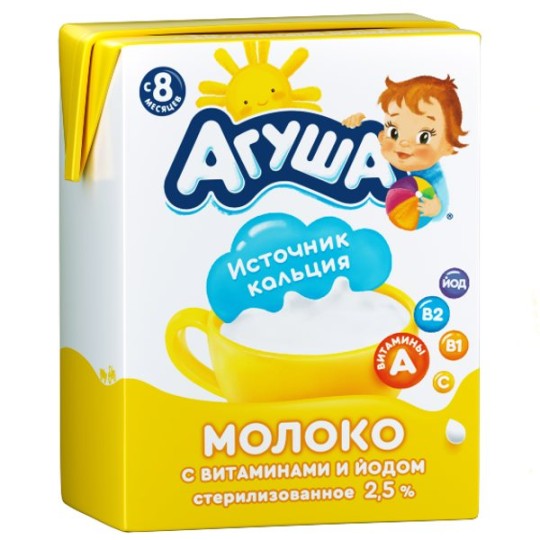 Детское Молоко Агуша источник кальция ●Обогащенное витаминами ●Без вкуса ●Готово к употреблению. Удобно взять с собой ●Содержит витамины: А – для зрения, В1 – для нервной системы, В2 – для обмена веществ, С – для иммунитета, Йод – для умственной деятельности