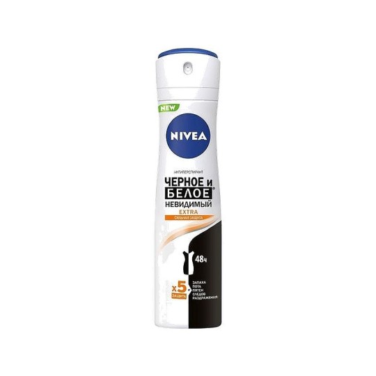 Дезодорант-антиперспирант спрей NIVEA Черное и Белое Невидимый Extra предотвращает появление белых пятен на темной одежде и желтых пятен на светлой одежде. Черная одежда остается черной, а белая одежда дольше остается белой. Уникальная формула имеет 5 факторов защиты: от запаха, пота, пятен, следов и раздражения. Защищает кожу подмышек в течение 48 часов от пота и неприятного запаха. Этот чистый, кристальный и яркий сладковатый аромат - выражение естественной женственности. Не содержит этилового спирта. Сильная защита и забота о коже от Nivea на каждый день! Применение: хорошо встряхнуть перед использованием. Распылять в области подмышек с расстояния 15-20 см. Дать полностью высохнуть во избежание образования пятен на одежде.
