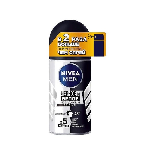 Роликовый дезодорант-антиперспирант NIVEA MEN Черное и Белое Невидимый Original предотвращает появление белых пятен на темной одежде и желтых пятен на светлой. Черная одежда остается черной, а белая одежда дольше остается белой. Уникальная формула имеет 5 факторов защиты от: запаха, пота, пятен, следов и раздражения. Защищает кожу подмышек от неприятного запаха в течение 48 часов. Не содержит этилового спирта. Настоящий мужской аромат для ощущения чистоты и свежести на весь день. Сильная защита и забота о коже от Nivea на каждый день! Шариковый антиперспирант даёт в 2 раза больше применений, чем спрей! Применение: нанести на чистую сухую область подмышек. Дать полностью высохнуть во избежание образования пятен на одежде. Не наносить на поврежденную или раздраженную кожу.
