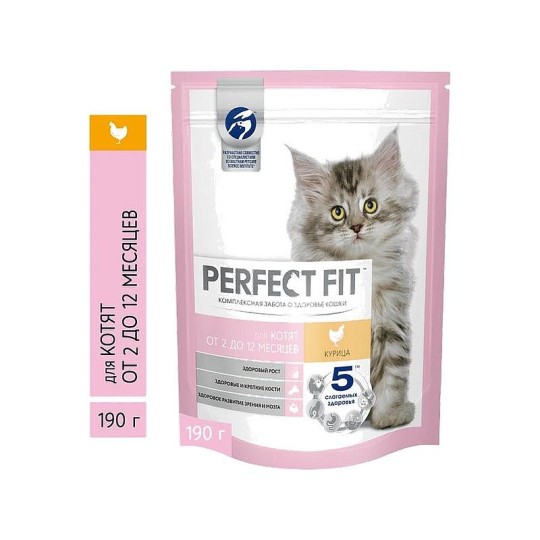 Сухой рацион PERFECT FIT™ для котят от 2 до 12 месяцев содержит всё самое необходимое для здорового роста котёнка: важнейшие микро- и макро- элементы, такие, как кальций и фосфор, для укрепления костей и жирные кислоты класса Омега-3 для развития мозга и остроты зрения. Здоровый рост Богат белком высокого качества, содержит необходимые макро и микро элементы для здорового роста котенка Здоровые и крепкие кости Сбалансированный уровень кальция и фосфора помогает здоровому росту и развитию костей Здоровое развитие зрения и мозга Содержит Омега-3 жирную кислоту, входящую в состав молока кормящей кошки и способствующую развитию мозговой деятельности и зрения котят