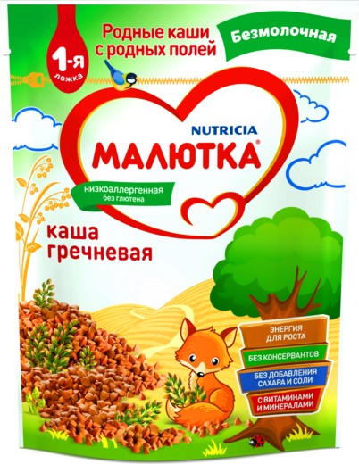 Безмолочная гречневая каша Малютка рекомендуется специалистами в качестве первого прикорма поскольку она не содержит глютена и богата полезными микроэлементами. Витамины группы В минералы и ценные аминокислоты которые содержит гречка необходимы организму малыша для полноценного роста и развития. - для детей с 4 месяцев; - в кашу входит целый ряд витаминов и минералов необходимых для полноценного развития ребенка; - легко усваивается и обеспечивает крохе правильное развитие рост а также заряд энергии до следующего приема пищи; - без соли молока и сахара; - без консервантов красителей и ГМО.