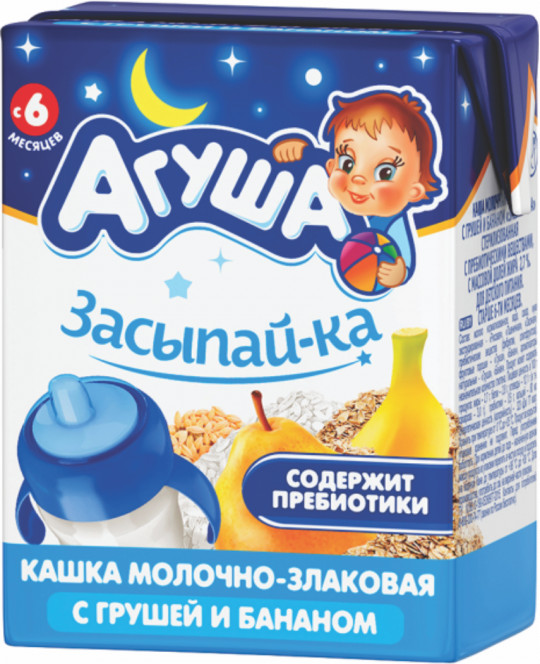 Каша Агуша молочно-злаковая: кроме молока и 3 злаков содержит фруктовые порошки «груша» и «банан». Для сладости добавлен сахар. Упакована каша в удобную коробочку-тетрапак и снабжена трубочкой. Вес 200 г — как раз порция на одно питание для малыша от полугода. - для детей с 6 месяцев; - способствует росту; - пребиотики обеспечивают правильную среду питания пробиотиков то есть способствуют нормальному пищеварению и защите организма от вредных бактерий; - без консервантов красителей и ГМО.