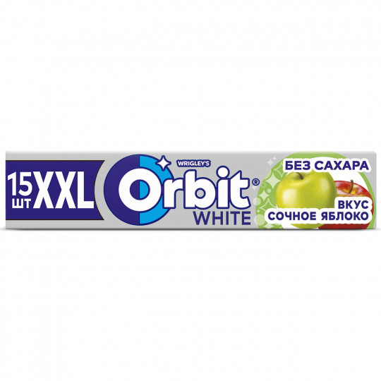 Жевательная резинка XXL размера "Orbit® Белоснежный Сочное яблоко" без сахара способствует поддержанию здоровья зубов: удаляет остатки пищи, способствует уменьшению зубного налета, нейтрализует вредные кислоты