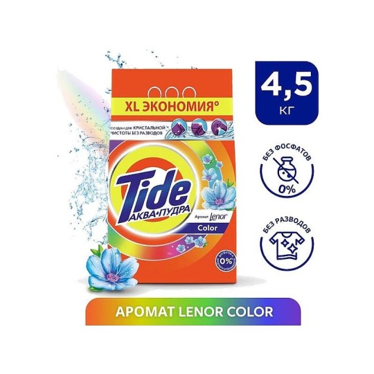 Стиральный порошок Tide Аквапудра Touch Of Lenor Color прекрасно отстирывает вещи и не оставляет следов. Аквапудра растворяется при контакте с водой и мгновенно начинает свое действие, обеспечивая превосходное очищение. Порошок способен справиться даже с самыми трудновыводимыми пятнами на одежде, включая такие непростые области, как манжеты, воротнички и подмышки. Используйте вместе с кондиционером для белья Lenor, который придает белью еще больше мягкости и свежести.