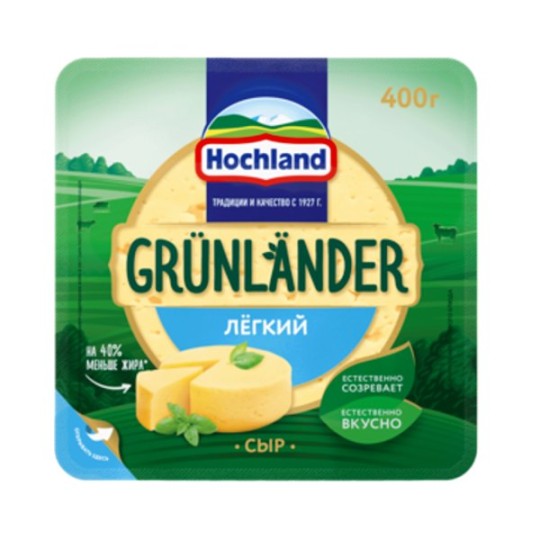 Grünländer "легкий "- естественно вкусный полутвердый сыр от компании Hochland с нежными молочными нотками. Содержит 18 г жира и 29 г белка на 100г продукта. Продается в упаковке, которую удобно хранить после вскрытия!