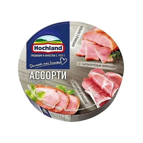 Сыр плавленый HOCHLAND ассорти деликатесное, 140 г – отличное решение для вашего обеда. Сливочный сыр имеет исключительно нежный и легкий вкус и консистенцию, которая позволяет легко намазывать массу на хлеб. Круглая коробочка содержит 8 порций сыра с разными вкусами, которые приправлены разнообразными добавками и специями – карбонад и говядина, ветчина, подкопченная на костре, черный перец и ароматный чеснок. Продукт удобен для использования дома, но его также можно взять с собой в дорогу или в офис. Производитель: ООО "Хохланд Руссланд", Россия. Состав: сыр твердых сортов, масло сливочное, сухое молоко обезжиренное, сыворотка молочная сухая, мясо карбонад варено-копченый, идентичные натуральным ароматизаторы ветчины и дыма, перец черный дробленый (для сыра карбонад с перцем), говядина варено-копченая филейная часть, натуральный ароматизатор говядины, натуральный экстракт чеснока, натуральный ароматизатор лука, окорок свиной сырокопченый, натуральный ароматизатор пряностей, регулятор кислотности, эмульгаторы, соль пищевая, вода питьевая. Пищевая ценность: белки – 9 г, углеводы – 5 г, жиры – 27 г. Энергетическая ценность: 229 ккал. Срок годности: 6 месяцев. Условия хранения: при температуре от 2°C до 8°C. ГОСТ ТУ 9225-014-53130062-14.
