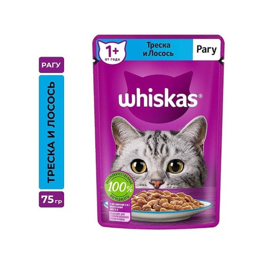 Влажный корм WHISKAS® для кошек, рагу с треской и лососем, 75г купить по цене от 243 ₸₸ с бесплатной доставкой | Instashop